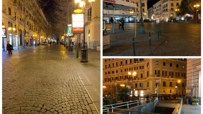 Le strade e le piazze vuote. I negozi, i ristoranti e i bar chiusi. Il silenzio regna. Questa è Napoli alle 20 di un martedì di coronavirus.