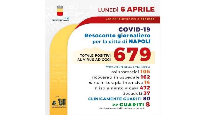Aumentano di 8 unità le persone positive al Covid-19 a Napoli. Sono dunque 679 i contagi dall’inizio dell’emergenza in città. Nelle ultime 24 ore, secondo i dati del Comune, aggiornati alle 12 di oggi, si registra anche un nuovo decesso e salgono a 37 le vittime del coronavirus.