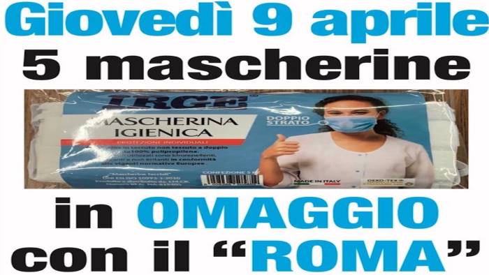 Domani, giovedì nove Aprile nelle edicole di Napoli per chi acquista “Il Roma” ci sarà in omaggio una confezione da cinque mascherine. Così il quotidiano ha spiegato l'iniziativa: