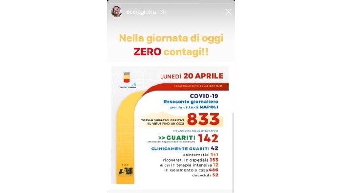 Il sindaco di Napoli, Luigi de Magistris, dal suo profilo Instagram annuncia che in città il contagio da coronavirus sarebbe azzerato.