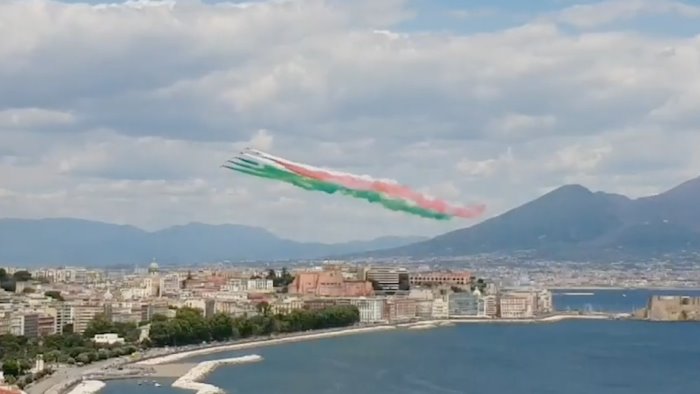 Le frecce tricolori hanno voluto omaggiare la città di Napoli colorando il cielo partenopeo con i loro fumi.