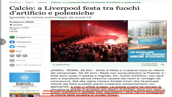 Semplicemente agghiacciante il lancio dell'Ansa sulla vittoria del Liverpool e relativi festeggiamenti. Il cronista, bellamente, scrive testuale: “ La polizia invano ha cercato di chiudere le strade di accesso allo stadio di Anfield, dove con razzi e fuochi d'artificio IN PERFETTO STILE NAPOLETANO i tifosi hanno festeggiato la vittoria della squadra di Jurgen Klopp”.