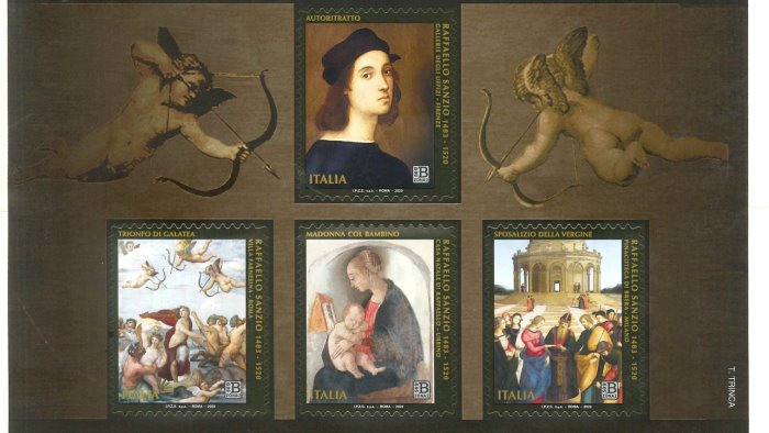Poste Italiane comunica che oggi 20 luglio 2020 vengono emessi dal Ministero dello Sviluppo Economico quattro francobolli ordinari racchiusi in foglietto appartenenti alla serie tematica “il Patrimonio artistico e culturale italiano” dedicati a Raffaello Sanzio, nel V centenario della scomparsa, relativi al valore della tariffa B zona 2 50g, pari a 3,90€.
