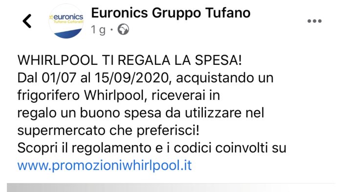 “WHIRLPOOL TI REGALA LA SPESA! - si legge nel post - acquistando un frigorifero Whirlpool, riceverai in