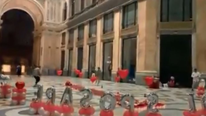 Musica ad altissimo volume, tappeto rosso, palloncini a forma di cuore che fanno da steccato immaginario ad un red carpet del trash e infine i fuochi d’artificio ad affumicare e illuminare uno dei luoghi pedonali più trafficati di Napoli. Fotografie, applausi, urla e commozione.
