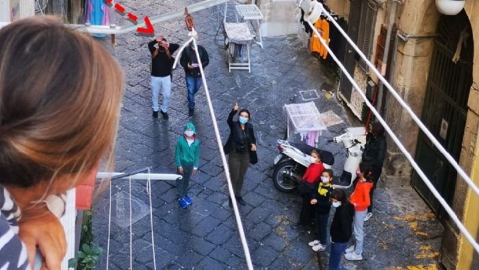 Con la sospensione della didattica in presenza prevista dall'ordinanza 79 della Regione Campania, l'insegnante ha deciso di portare la lezione, che rientra in un programma educativo dedicato a Gianni Rodari nel centenario della sua nascita, direttamente sotto casa dei suoi alunni.