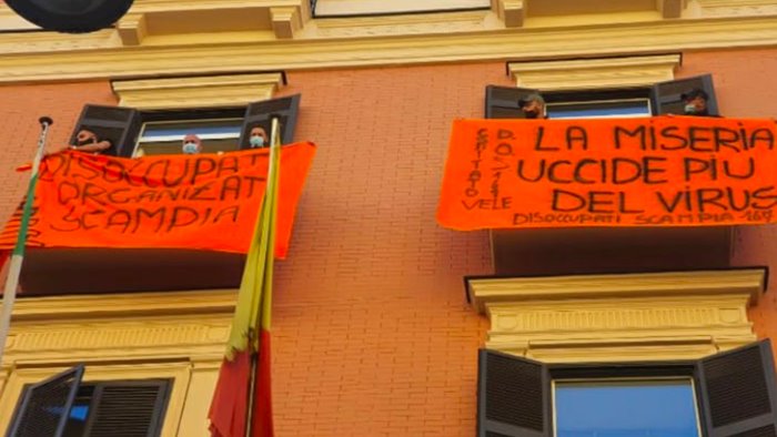 Un gruppo di disoccupati organizzati di Scampia 167 hanno occupato il Palazzo del Consiglio Comunale di Napoli in via Verdi, esponendo due striscioni sui quali si legge: “la miseria uccide più del virus”.