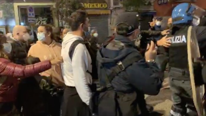 Il corteo e' gia' stato fermato due volte dalle forze dell'ordine. Tensioni e molte occasioni di scontro. La prima all'incrocio tra via Scarlatti e via Luca Giordano, e alcuni manifestanti hanno parlando con la polizia. Davanti al teatro Diana 4 blindati e molti agenti. Poi si riprende a sfilare verso via Luca Giordano al grido di 'Liberta', liberta'' e 'De Luca vaff...'. All'altezza di un punto vendita di una nota catena di supermercati, due blindati e altri agenti bloccano di nuovo i manifestanti; qualche momento di tensione, qualche spintone, ma il corteo riparte per piazza degli Artisti.