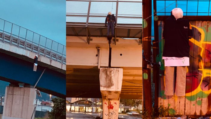 Stamattina all’alba sono apparsi dei fantocci con le magliette Whirlpool, che “appesi ad un filo” sono stati calati dai cavalcavia di via Galileo Ferraris all’incrocio con via delle Brecce, del Centro Direzionale e dal ponte che possa proprio sopra lo stabilimento Whirlpool di via Argine.