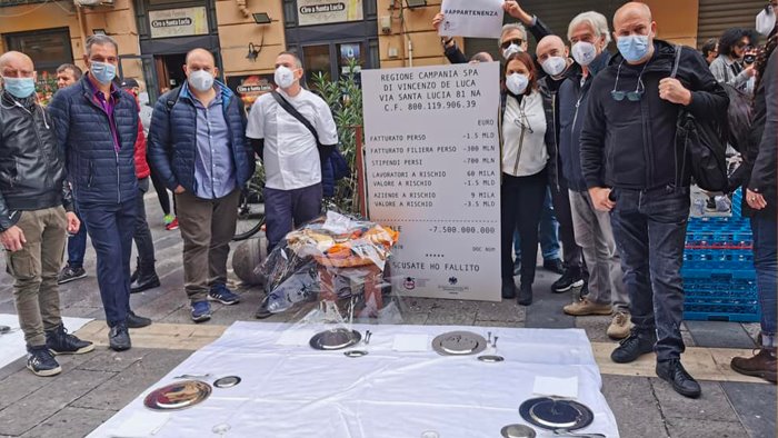 I ristoratori e i titolari di bar si sono riuniti davanti al palazzo della Regione a Santa Lucia e nell’area pedonale hanno apparecchiato sulla strada delle vere e proprie tavole. Il direttore generale di Confcommercio Campania, Pasquale Russo ha sottolineato che quella di oggi a Napoli “è una manifestazione per rendere plastica la situazione dei pubblici esercizi, cioè: siamo a terra. Le aziende non possono reggere ulteriori limitazioni - ha aggiunto Russo - i consumi hanno già subito diminuzioni incredibili. Noi vogliamo lavorare, ma se non è possibile allora il Governo deve fare bene, presto e subito per aiutare le imprese a sopravvivere".