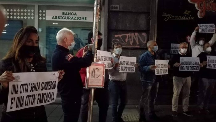 "Una citta' senza commercio è una città fantasma" e "Blocco di tutte le tasse fino a fine emergenza" sono gli slogan che si leggono sui cartelli esibiti dai manifestanti che chiedono aiuti al Governo e si schierano al fianco dei titolari degli esercizi più penalizzati dalle limitazioni imposte.