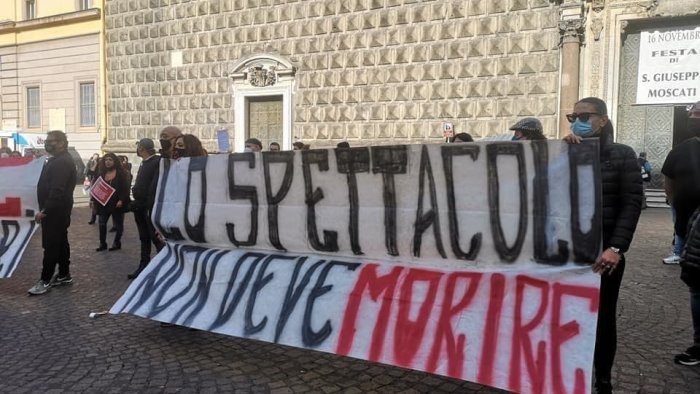 Anche a Napoli è sceso in piazza a protestare il mondo dello spettacolo. Una manifestazione nazionale convocata con l’hashtag #AssenzaSpettacolare e che vede il mondo della cultura voler mostrare la sua rabbia per quella che hanno definito una falsa ripartenza.