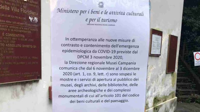 In ottemperanza alle nuove misure di contrasto e contenimento dell'emergenza epidemiologica da Covid-19 previste dal DPCM 3 novembre 2020, la Direzione regionale Musei Campania comunica che dal 6 novembre al 3 dicembre 2020 (art. 1, co. 9, lett. r) sono sospesi le mostre e i servizi di apertura al pubblico dei musei, degli archivi, delle biblioteche, delle aree archeologiche e dei complessi monumentali di cui all'articolo 101 del codice dei beni culturali e del paesaggio.