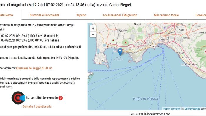 Un terremoto di magnitudo 2.2 si è verificato nella zona dei Campi Flegrei, in regione Campania, alle 4.13 della notte scorsa con una profondità di 2 km. Il terremoto è stato localizzato dalla Sala Operativa dell'Ingv. La scossa, probabilmente legata al bradisisma, è stato avvertito dalla popolazione.
