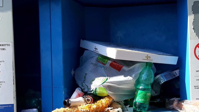 Il raccoglitore di indumenti usati in questione, installato sul lungomare di Napoli all’altezza di via Nazario Sauro, è stato utilizzato (evidente da persone incivili e poco rispettose del prossimo) come pattumiera dove gettare cartoni per le pizze, resti di cibo, bottiglie e plastica.