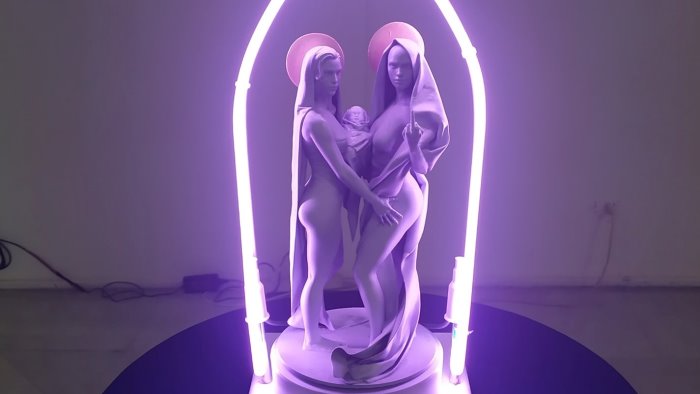 "Avremmo voluto comunicare soltanto buone notizie, e invece siamo spiacenti di segnalare che, ad un check dei lavori effettuato per decidere cosa portare, ci siamo accorti che Immaculata Conceptio in Vitro dell’artista di subvertising DoubleWhy è stata trafugata. La scatola che la conteneva era stata ricomposta, in modo da sembrare integra. Solo dopo aver strappato via un ulteriore scotch di protezione (che in realtà serviva solo a trattenere sul coperchio una busta contenente adesivi e spillette) ci siamo resi conto che in realtà il nastro da imballaggio che sigillava i bordi era stato tagliato con chirurgica precisione lungo tre lati, e che la scatola era di fatto vuota. Restano in nostro possesso soltanto i fiocchi di polistirolo, un’aureola dorata e la targhetta di una delle opere più apprezzate della mostra. Riteniamo che il furto sia avvenuto nel corso delle operazioni di smontaggio o di trasporto e che si sia trattato di un’operazione mirata, in quanto nessuna altra opera ha subito danni o è stata sottratta, e nessun altro imballo risulta manomesso. Il complesso scultoreo è in resina, realizzato in stampa digitale 3D, montato su una base rotante e sormontato da arco a neon. L'opera ha un diametro di circa 10 cm ed è alta circa 30 cm. Se qualcuno fosse a conoscenza di tentativi di ricettazione o esposizione dell’opera, può segnalarci la cosa. Abbiamo ovviamente sporto denuncia. Inoltre la direzione artistica ed organizzativa, capitanata da Emanuela Marmo, è in procinto di pubblicare sui canali ufficiali il bilancio della kermesse. Un dovuto atto di trasparenza nei confronti di quanti e quante ne abbiano sostenuto la realizzazione attraverso le donazioni spontanee, la partecipazione alla campagna di crowdfunding e le sottoscrizioni libere nel corso degli appuntamenti.