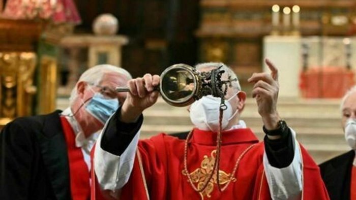 "Eccezionalmente celebrato sull'altare maggiore della Cattedrale napoletana, e non come di consueto nella Cappella a Lui dedicata per le norme anti covid, il consueto sventolio del fazzoletto bianco quest'anno è stato affidato al deputato Pierluigi Sanfelice di Bagnoli, facente parte di una delle più antiche famiglie del patriziato napoletano, e componente della Deputazione della Cappella di San Gennaro - si spiega - Alle 19,00 la teca con le ampolle del sangue del Santo Patrono di Napoli verranno riposte nella cassaforte d'argento della Cappella".