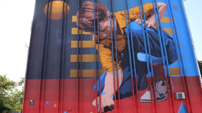 A marcare il gruppo di atleti raffigurati è una grande onda, mentre sullo sfondo campeggia il ben noto Monte Somma. L’opera completa il trittico con le due precedenti già realizzate sulle facciate di edilizia popolare di Via Amendola.