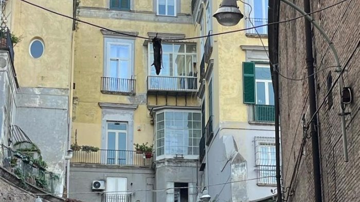 Come documentato durante un sopralluogo dal Consigliere Regionale di Europa Verde Francesco Emilio Borrelli, più volte intervenuto su questa zona di Napoli, il topo morto da alcuni giorni resta appeso su di un cavo sospeso tra due muri.