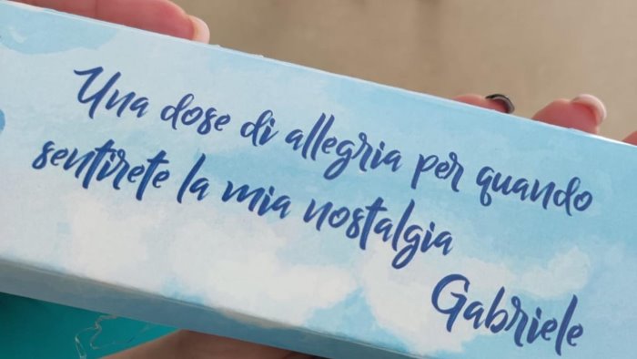 Prima di andare via, però, Gabriele ha sorpreso tutti i presenti e «con le sue piccole manine» e «il suo sguardo tenero» ha camminato verso ogni medico, infermiere e musicoterapista, nei suoi calzini gialli e marroni, e ha portato a ciascuno di loro, un pacchettino di dolcetti. Sopra la confezione, c'è scritto: “Una dose di allegria per quando sentirete la mia nostalgia”. «Lì la lacrimuccia di nostalgia è scappata a tutti, perché Gabriele è diventato il bambino di tutti e la mancanza si sentirà eccome». ?