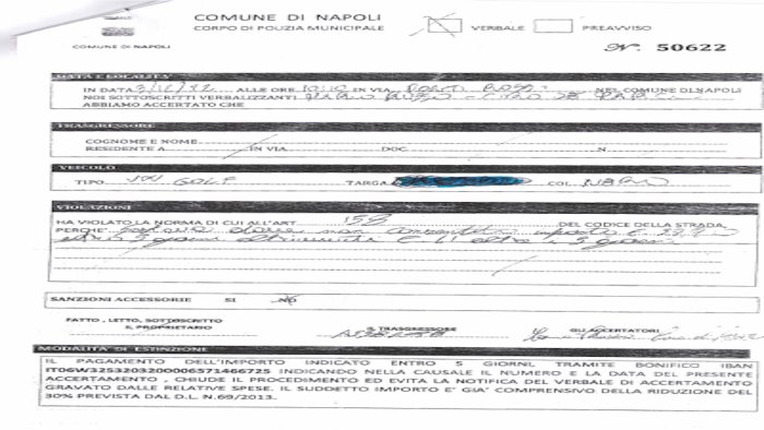 Il verbale è quasi identico a quello emesso dai vigili urbani del Comune di Napoli, ma l'iban su cui si invita il numero di conto corrente su cui si invita a pagare entro cinque giorni l'importo indicato - che solitamente è di euro 29,90 - non è quello dell'ente. Da giorni circolano a Napoli verbali contraffatti al Codice della Strada.