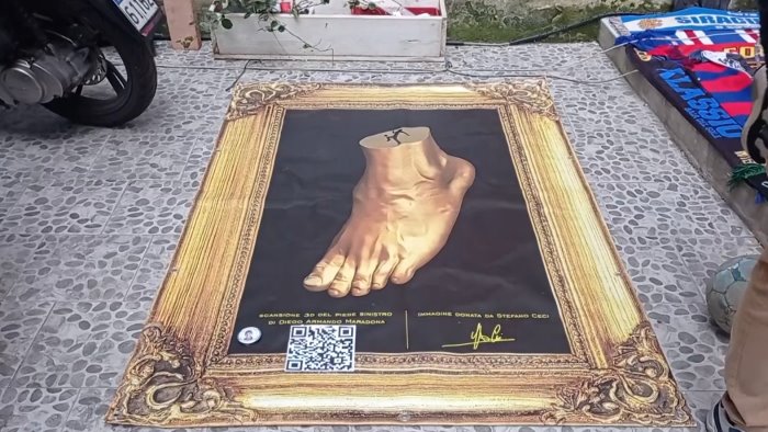 L’opera era stata donata da Stefano Ceci - storico amico di Diego - e affissa proprio accanto al murales dedicato al campione argentino nel cuore del Quartieri Spagnoli. La riproduzione del piede sinistro di Maradona era stata sistemata nel giorno in cui nacque Diego nel 1960. Sul quadro c'è anche il Qr Code per la scansione per accedere a dei contenuti multimediali relativi alla storia di Maradona.