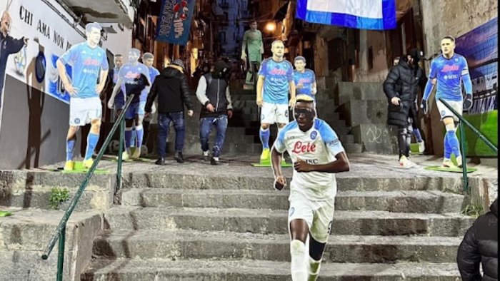 Gli undici giocatori azzurri, con al fianco il tecnico Spalletti e il presidente De Laurentiis, sagome ad altezza naturale. E' questo il nuovo segno di grande amore e attesa della città di Napoli per il sogno scudetto che è stato posto dai tifosi partenopei dei Quartieri Spagnoli sulle scale di Vico Colonne a Cariati, nel pieno dei vicoli del centro, a 50 metri da piazzetta Maradona. La foto dell'undici azzurro schierato come una formazione aperta dal portiere azzurro Meret e chiusa dal tris d'attacco Lozano, Osimhen, Kvatratskhelia hanno subito avuto un boom sui social e il luogo è diventato una nuova tappa per i napoletani ma anche per le migliaia di turisti che già da questo week end ricominciano a frequentare Napoli, dopo il calo invernale. In diversi quartieri di Napoli si moltiplicano le bancarelle che vendono bandiere del Napoli e magliette dei calciatori azzurri, tra cui quella con il 3: il numero di Kim ma soprattutto quello di titoli che i napoletani sognano di raggiungere.