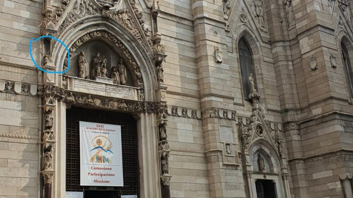 Qualcuno lo ha interpretato come un segno premonitore del destino... anzi no di San Gennaro. Sulla facciata del Duomo di Napoli dove è custodito il tesoro del santo patrono, stamane la sorpresa: un pallone è rimasto incastrato dietro una statua del portale principale. L'aspetto curioso della storia è che il pallone, probabilmente lanciato da qualche ragazzo durante una delle tante partitelle di strada nei quartieri, si trova in una posizione irragiungibile,troppo in alto, tanto che il Comune di Napoli, su richiesta del consigliere comunale Nino Simeone (presidente della Commissione mobilità) ha richiesto l'intervento dei vigili del fuoco per rimuovere il pallone. Il nuovo regolamento comunale sulla Sicurezza Urbana, infatti, vieta di giocare a pallone nei pressi di aree, beni storici, artistici, monumentali e dei luoghi di culto.