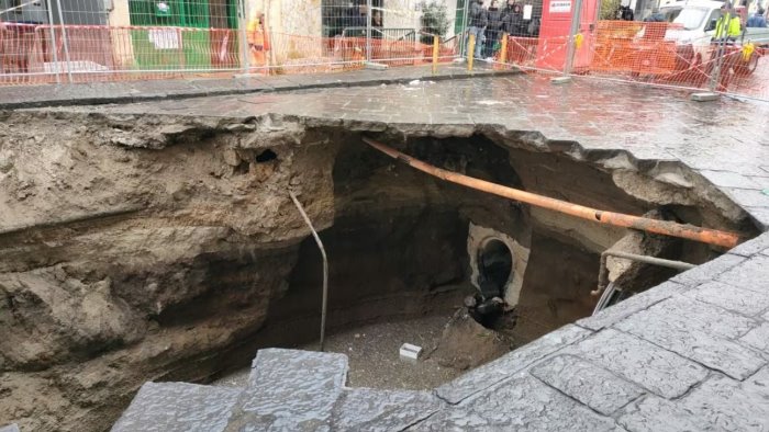 da quanto si apprende sembra che la strada sia sprofondata a causa del cedimento di una fognatura. L’Abc, l'azienda idrica, sta già lavorando per la messa in sicurezza e il ripristino, ma per ora ci sono decine di famiglie senza acqua né gas.Si valuta l'installazione di colonnine per il rifornimento di acqua nella zona.