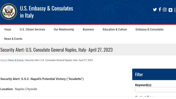 E' apparso infatti in queste ore un Security Alert sulla pagina ufficiale di U.S. Consulate General Naples per la data del 27 aprile 2023.