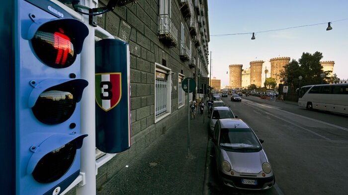 Per celebrare il terzo scudetto anche un semaforo, nel cuore di Napoli, si tinge di tricolore e d'azzurro.