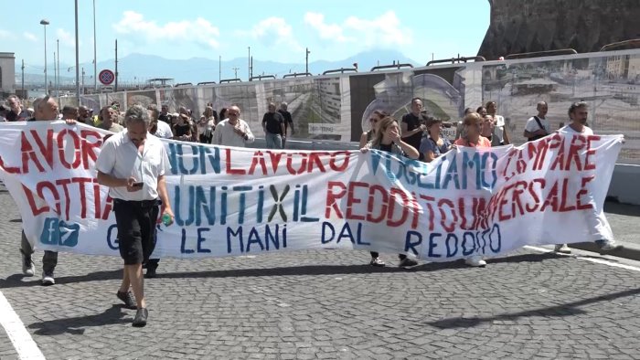 Si è conclusa dinanzi alla sede della Regione Campania, a via Santa Lucia, la manifestazione che ha visto in mattinata scendere lungo le vie di Napoli circa trecento persone per reclamare il lavoro e protestare per i tagli alla misura del reddito di cittadinanza. Anche davanti al palazzo della Regione - come in precedenza - i manifestanti hanno scandito cori ed esposto i loro striscioni. Il corteo era partito alle 11 da piazza del Gesù per poi attraversare il centro storico, via Mezzocannone, Corso Umberto, via Acton, fino ad approdare a piazza Municipio e quindi a Santa Lucia. Lungo il percorso cori e insulti all'indirizzo del Governo e l'attuazione di tre blocchi stradali, sia pure di breve durata e con impatto minimo sulla circolazione. Il corteo è stato scortato da un drappello di poliziotti. Non si sono registrati disordini o momenti di tensione.