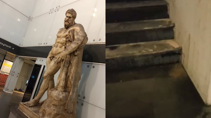Scalini divelti, pavimentazione corrosa, feci e urine su pavimenti e pareti e soprattutto una puzza che rende l'aria irrespirabile. In queste condizioni si presentano le scale di emergenza che collegano l'atrio della stazione Museo alle banchine della metropolitana Linea 1. Metropolitana, parte integrante del circuito delle Stazioni dell'Arte con un corredo di opere e architettura di primo piano nello scenario contemporaneo.