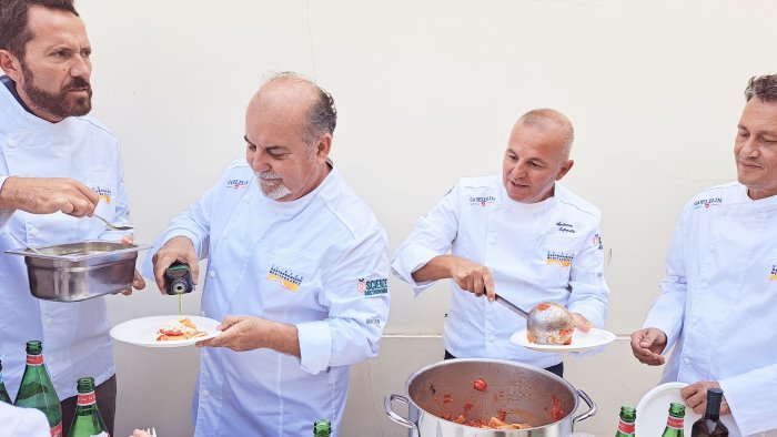 Ai fornelli, nella cucina del corso di Scienze Gastronomiche Mediterranee, gli Chef Ludovico D'Urso, Giuseppe Sorrentino e Antonio Esposito dell'Associazione Provinciale Cuochi Napoli insieme al professore Sacchi. Hanno dato un saggio di un pasto possibile, realizzato secondo criteri e ingredienti della cucina mediterranea, preparando dei paccheri con pomodorini, olio e formaggio del territorio. Tutto sarà tracciato ed etichettato, saranno indicate pure le modalità di smaltimento dei contenitori in cui saranno posti gli alimenti per la distribuzione. Verranno lanciati anche dei messaggi relativi ai fondamenti di una sana alimentazione su tovagliette appositamente realizzate.