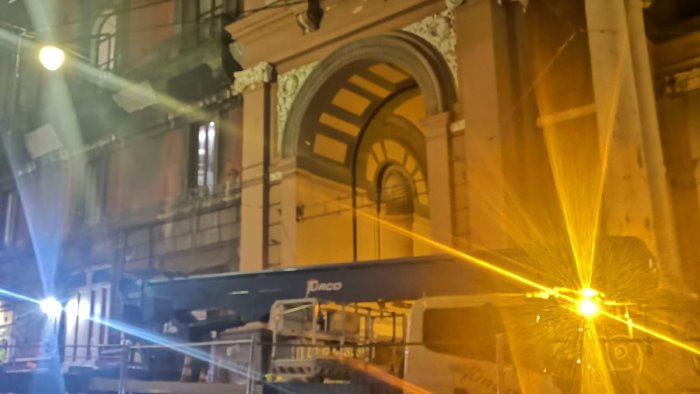 Nel corso della notte sono stati effettuati dai servizi comunali, con il supporto della Napoli Servizi, verifiche e saggi sulla muratura e gli elementi decorativi della facciata della Galleria Principe di Napoli in Via Pessina.