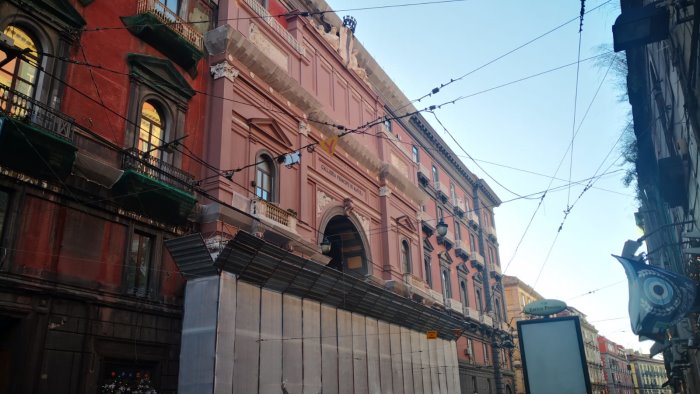 Sono terminati la scorsa notte i lavori di messa in sicurezza della facciata della Galleria Principe di Napoli in Via Pessina. Dopo l’installazione delle ultime reti protettive sulla facciata esterna della Galleria, i tecnici della Napoli Servizi - con il supporto di una ditta specializzata - hanno montato una mantovana di protezione ad un’altezza di circa 12 metri, sorretta da un ponteggio in ferro.
