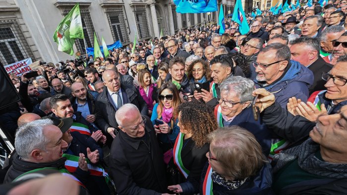 "L'unico insulto ieri lo ha rivolto la Meloni a chi è andato a manifestare perché in un Paese democratico non decide la Meloni chi e quando deve manifestare". "Ho parlato ieri a piazza Santi Apostoli per un'ora e nessuno ha offeso nessuno. Hanno mandato in giro un fuori onda mentre ero a Montecitorio a bere un bicchiere d'acqua. De luca non arretra e continua a parlare alla platea. "Leggo che sui giornali i titoli sono per il mio insulto alla Meloni. Il vero insulto lo ha fatto questo Governo, bloccando per un anno e mezzo i fondi Fsc che servono al Sud per ridurre il divario con il Nord. L'insulto è quello di non aver fatto trovare nessuno e non aver dato risposte a 200 sindaci e migliaia di cittadini italiani". E poi ha concluso: "Non arretreremo di un millimetro. Come ho detto ieri ad un funzionario di polizia: la prossima volta mi devono solo sparare in testa se mi vogliono fermare".