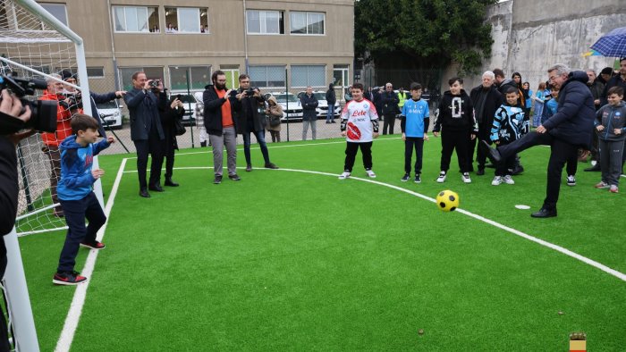 Un nuovo spazio a disposizione dei ragazzi del rione Amicizia, nella III Municipalità. È stato inaugurato questa mattina il campetto di calcio del plesso “San Francesco” dell’istituto scolastico comprensivo “Radice Sanzio Ammaturo”. Il nuovo impianto è uno degli interventi programmati dal Tavolo per l’Infanzia e l’Adolescenza promosso dal sindaco Gaetano Manfredi, del quale fanno parte il coordinatore Paolo Siani, Gemma Tuccillo e Paolo Lattanzio. Il progetto è stato realizzato grazie ad un atto di mecenatismo dell’associazione Progetto Abbracci Onlus, presieduta da Claudio Zanfagna, che ha stipulato una convenzione con il Comune di Napoli.