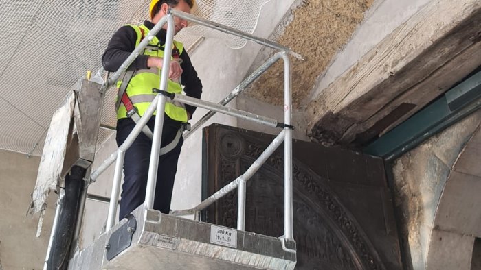 In meno di un mese, dalla caduta di una pietra davanti alla biglietteria, sono state eseguite tutte le verifiche e la messa in sicurezza a mezzo di una piattaforma aerea che ha consentito di lavorare ad alta quota, fino a 30 metri di altezza, per esaminare tutte le facciate interne ed asportare ogni elemento in grado di suscitare preoccupazione.