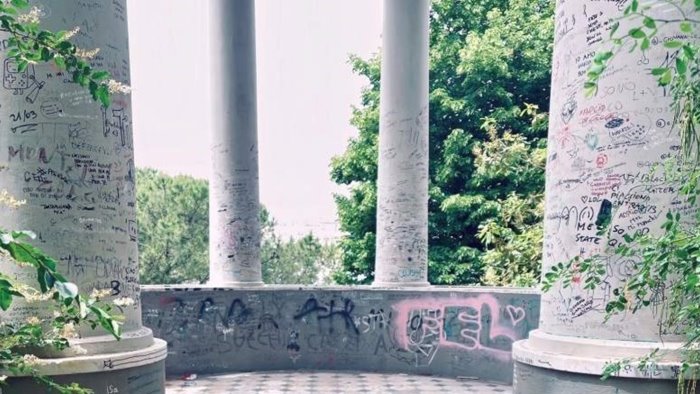 Allo stato risulta totalmente imbrattato, sia lungo il muretto che sulle sovrastanti colonne con scritte e con disegni anche osceni.