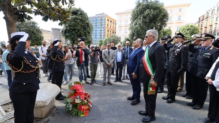 Nel 32esimo anniversario della strage di Capaci, l’assessore alla sicurezza e alla legalità del Comune di Napoli e il prefetto di Napoli Michele di Bari hanno deposto dei fiori davanti alla lapide in piazza Municipio che ricorda il sacrificio dei magistrati Giovanni Falcone e Paolo Borsellino e delle donne e uomini delle loro scorte.