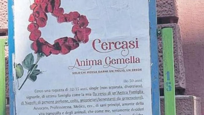 Un annuncio matrimoniale finalizzato ad avere un figlio: “Ho 50 anni, cerco una ragazza di 32-35 anni, single, signorile, di ottima famiglia come la mia – il testo affisso a Napoli –. Non ho preferenze fisiche, però quelle prosperose sono meravigliose”, si legge ancora nel manifesto, che si chiude con un indirizzom mail da contattare, inviando una presentazione e annessa fotografia.