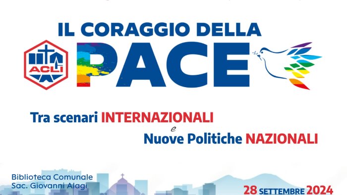 Sabato 28 settembre, a partire dalle 15.30, si terrà a San Giorgio a Cremano, nella biblioteca comunale di villa Bruno, l'assemblea congressuale delle Acli metropolitane di Napoli sul tema "Il coraggio della pace, tra scenari internazionali e nuove politiche nazionali".