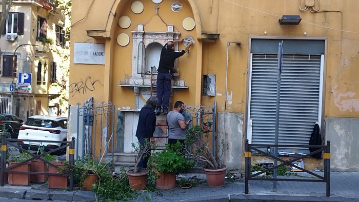 Operai al lavoro per ripristinare l’edicola votiva che ospita l’effigie di San Siro, che ora è tornata al suo posto, per la soddisfazione dei residenti del Vomero e non solo.