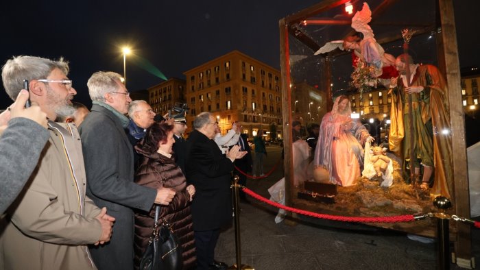 E' stata inaugurata ieri sera in Piazza Municipio "La Natività napoletana", un’opera a grandezza naturale realizzata dai maestri artigiani dell’associazione delle Botteghe di San Gregorio Armeno - coordinati dal presidente Vincenzo Capuano - in collaborazione con i maestri sarti dell’associazione Le Mani di Napoli, le associazioni dei Maestri Ceramisti e i ragazzi del Polo della Arti Caselli Palizzi, che hanno realizzato gli abiti e le anfore presenti sulla scena della Natività, e con gli artigiani del Borgo Orefici.