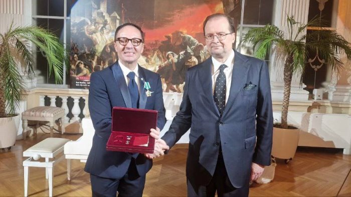 "Schiavo, dal 2015 Console Onorario della Federazione Russa, è il primo imprenditore campano a ricevere questa prestigiosa onorificenza, accolta con emozione e senso di responsabilità, ma anche con 'l’auspicio della pace e dell’economia, volendo favorire ancora di più il rapporto tra le imprese campane ed italiane e quella russofone. Questo riconoscimento non rappresenta per me un traguardo, bensì un nuovo punto di partenza. Lo accolgo con umiltà e con la ferma volontà di proseguire nel mio impegno per promuovere il dialogo, l’economia e la cooperazione tra i nostri Paesi, con un'attenzione particolare e profonda alla tutela e allo sviluppo delle imprese campane, del Sud e dell'Italia intera. In questi anni - ha riferito Vincenzo Schiavo - abbiamo promosso l’incontro tra 750 imprese italiane e altrettante russe, valorizzando la nostra città, la sua cultura e le sue eccellenze produttive. Abbiamo consolidato centinaia di accordi commerciali, rendendo Napoli, la Campania e il Mezzogiorno, fino a due anni fa, un importante punto di riferimento per il commercio e il turismo Russo. Contiamo, d'ora in poi, di consolidare In un contesto geopolitico così complesso, mi auguro che questo momento possa costituire un contributo simbolico verso una maggiore unità tra la Federazione Russa e l’Europa, ispirata ai principi di collaborazione, comprensione reciproca e pace'. La cerimonia si è svolta alla presenza di Alexey Paramonov, Ambasciatore Generale della Federazione Russa in Italia, del Console Generale Andrey Kharchenko, di decine ambasciatori e i consoli generali di numerosi Paesi e di molte altre personalità.
