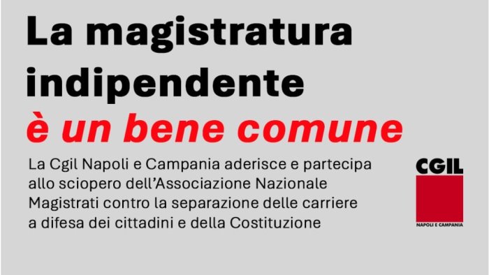 “La Cgil Napoli e Campania, in coerenza con l’orientamento assunto dalla confederazione a livello nazionale, condivide le ragioni alla base dello sciopero indetto dall’Associazione Nazionale Magistrati di Napoli per contrastare il disegno di legge di riforma costituzionale della Giustizia e conferma la partecipazione alle iniziative in programma a Napoli e in Campania per venerdi` 27 febbraio”. Cosi`, in una nota la segreteria metropolitana e regionale della Cgil.