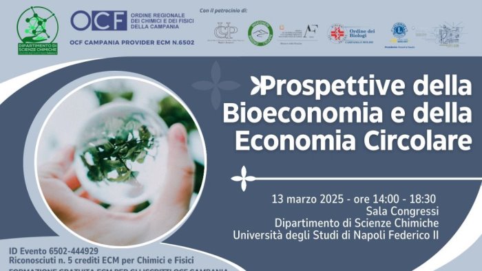 Il Dipartimento di Scienze Chimiche dell’Università degli Studi di Napoli Federico II e l’Ordine Regionale dei Chimici e dei Fisici della Campania, presieduto dalla Dott.ssa Rossella Fasulo, in qualità di ente provider ECM organizza l’evento gratuito "Prospettive della Bioeconomia e dell'Economia Circolare", che si terrà il 13 marzo presso la Sala Congressi del Dipartimento di Scienze Chimiche dell'Università degli Studi di Napoli Federico II. L’iniziativa, che rilascerà 5 crediti ECM per Chimici e Fisici, rappresenta un'importante occasione di confronto tra enti pubblici, industria e sistema finanziario sul ruolo della bioeconomia nello sviluppo sostenibile e nella transizione ecologica.