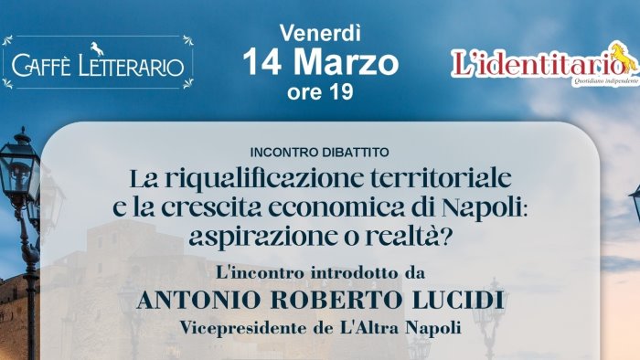 Domani venerdì 14 marzo alle ore 19:00, presso il Caffè Letterario L’Identitario (Via d’Alagno 26-28, adiacente a Piazzetta del Grande Archivio), si terrà un importante incontro dibattito dal titolo “La riqualificazione territoriale e la crescita economica di Napoli: aspirazione o realtà?”.