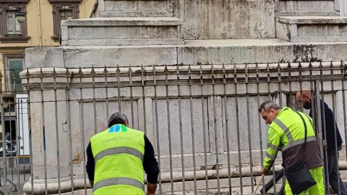 Un intervento particolare perché a protezione della statua è installata una recinzione in ferro che non permette una pulizia accurata quotidiana e che spesso diventa luogo di accumulo di rifiuti.